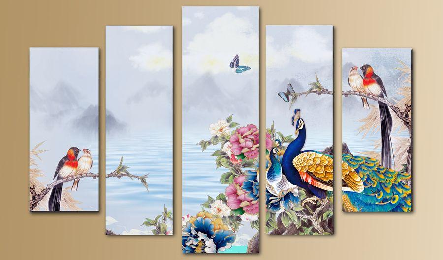 Картина изготовлена из искусственного холста, натянутого на деревянный подрамник (МДФ). Искусственный холст представляет собой синтетический материал (ПВХ), подобный натяжному потолку.Картина продается в готовом виде, Вам остается только повесить её на стену. Пятисоставная модульная картина.