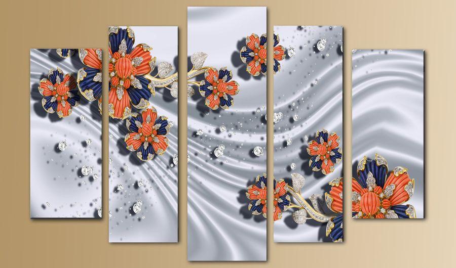 Картина изготовлена из искусственного холста, натянутого на деревянный подрамник (МДФ). Искусственный холст представляет собой синтетический материал (ПВХ), подобный натяжному потолку.Картина продается в готовом виде, Вам остается только повесить её на стену. Пятисоставная модульная картина.