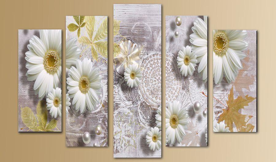 Картина изготовлена из искусственного холста, натянутого на деревянный подрамник (МДФ). Искусственный холст представляет собой синтетический материал (ПВХ), подобный натяжному потолку.Картина продается в готовом виде, Вам остается только повесить её на стену. Пятисоставная модульная картина.